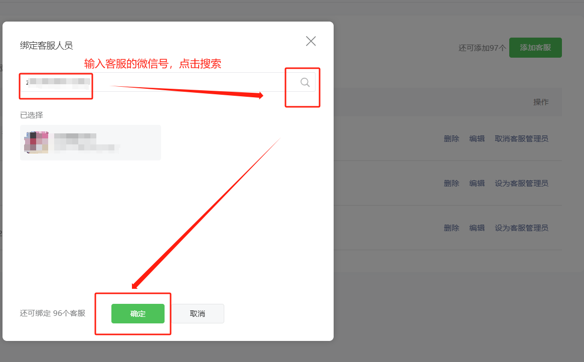点击左侧的【客服】-添加客服-输入客服微信号-搜索确定。