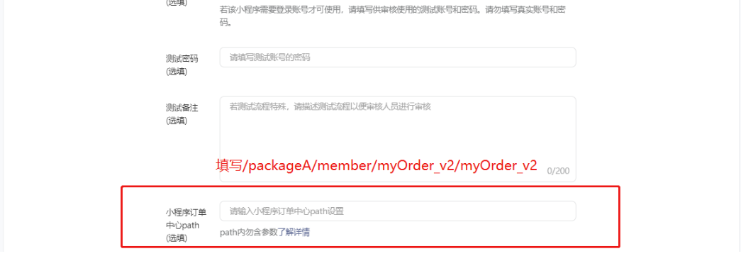 新增了设置path设置:代码提审环节设置订单中心path,填写: /packageA/member/myOrder_v2/myOrder_v2