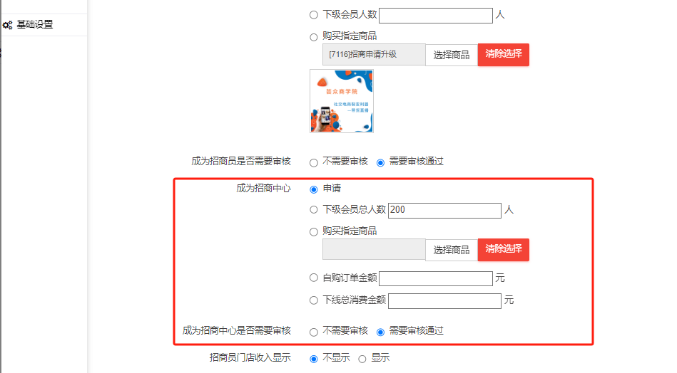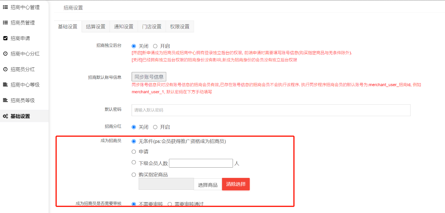 3.设置成为招商员的条件与成为招商员是否需要审核。