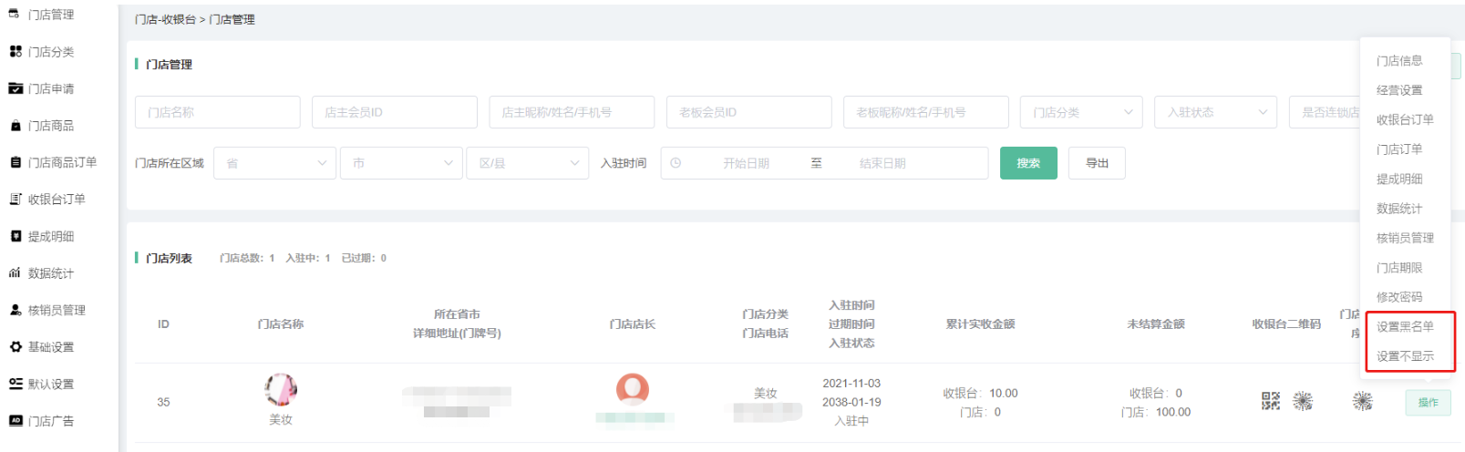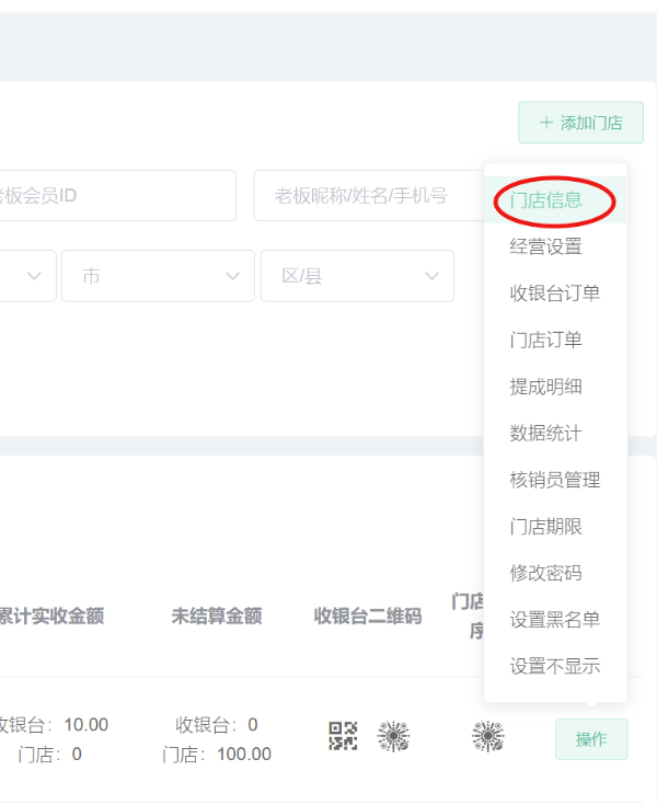 申请通过/后台添加的门店,在门店信息显示,可搜索查看门店的id、名称、所在省市详细地址、门店店长、门店分类、入驻时间、累计实收金额、未结算金额、收银台二维码、门店小程序码等