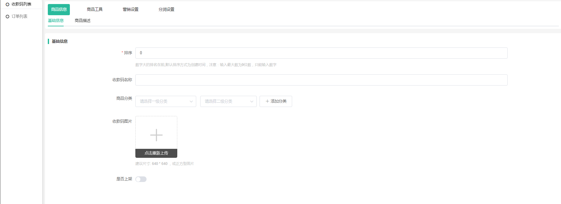 1、添加收款码,设置收款码名称、分类收款码图片,设置好后点击发布。分类为选填。排序:数字大靠前显示.