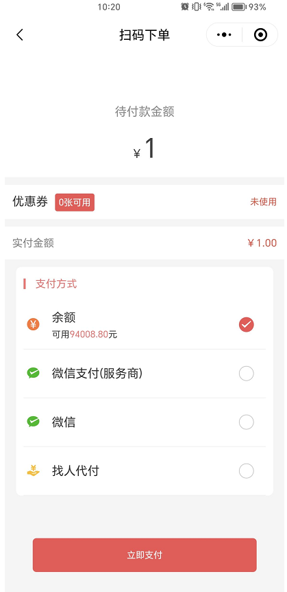 4、点击付款跳转到支付页面,在支付页面可查看到优惠,支付方式为商城商品的支付方式