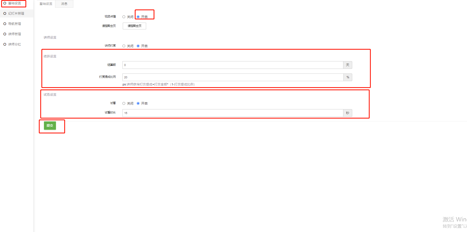 1.2基础设置-开启-打赏-提成比例-设置