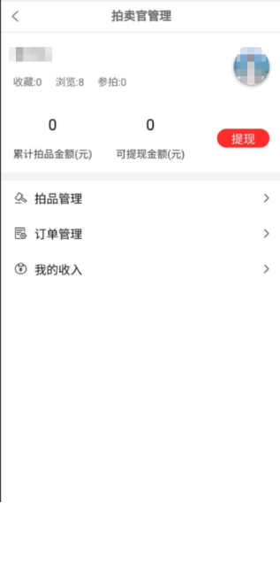 点击进入拍卖官店铺管理页面,拍品管理、订单管理、我的收入