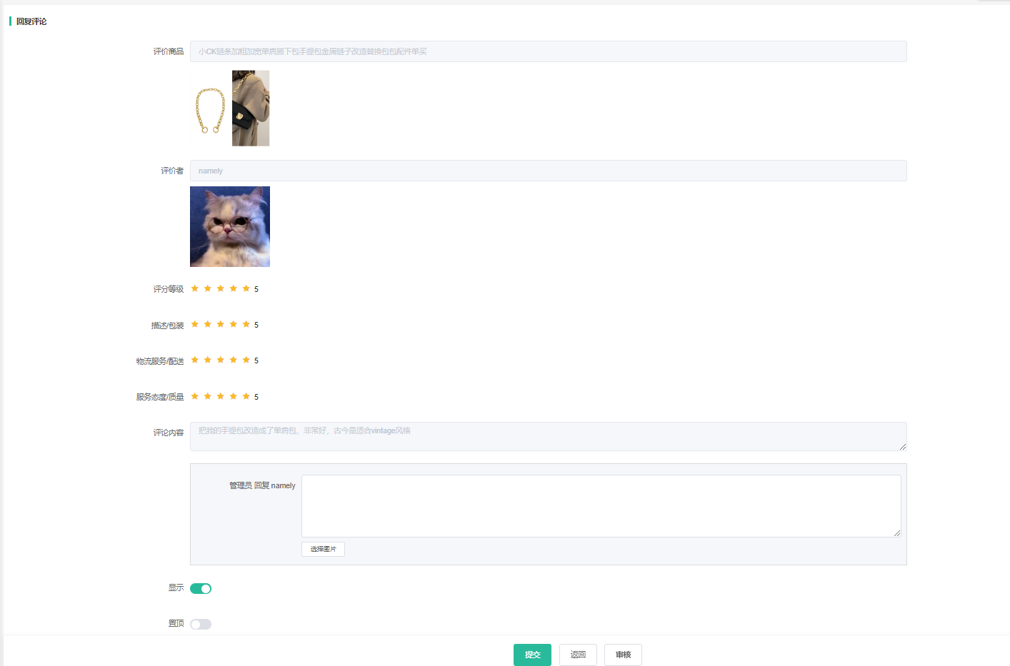 开启后会员评论(首次评价、追评)需要后台审核后才能在前端显示。用户对主评论的回复不用审核,可直接显示。