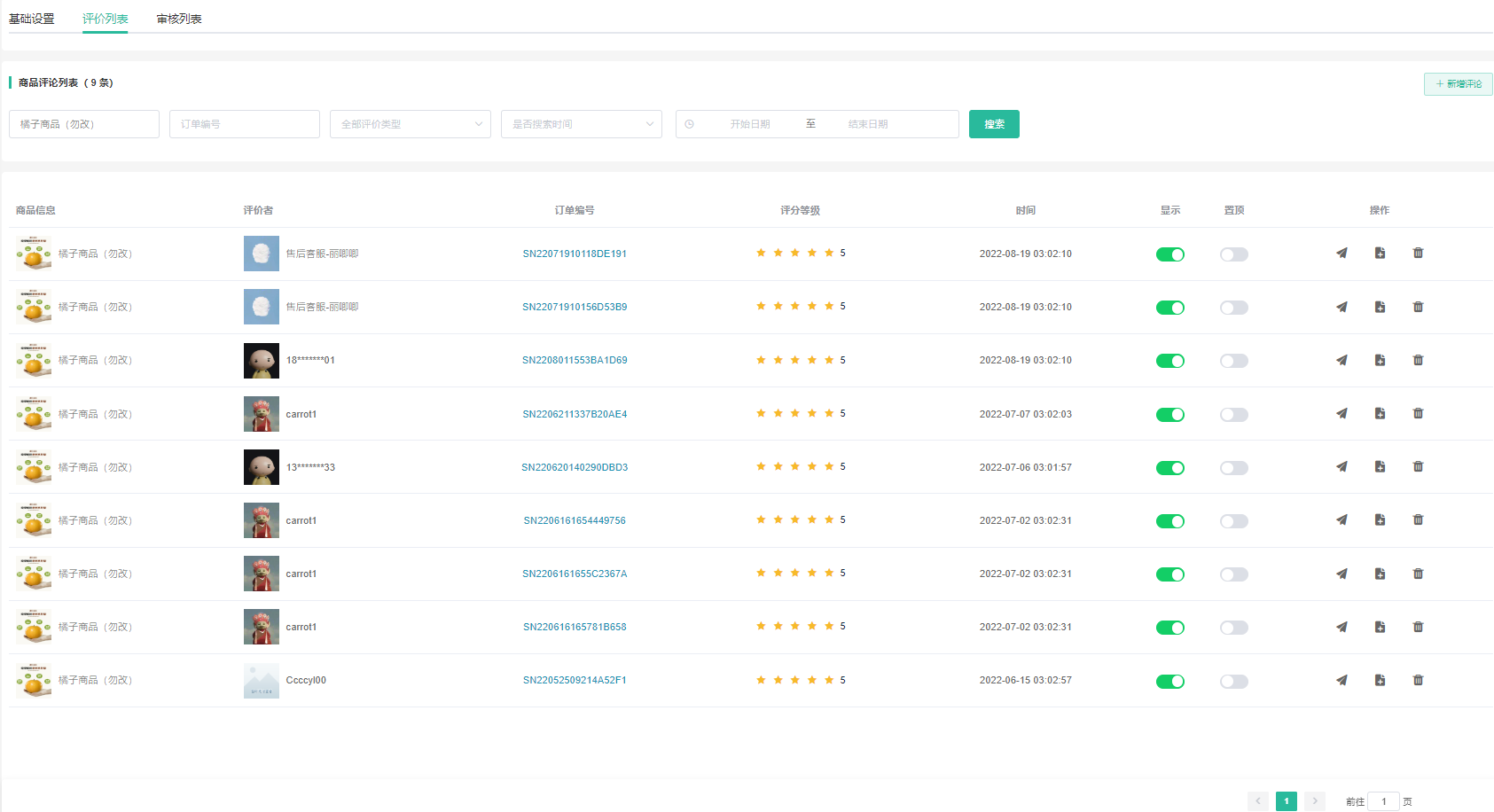 支持查看会员商品评价、是否通过审核、是否显示、是否置顶。