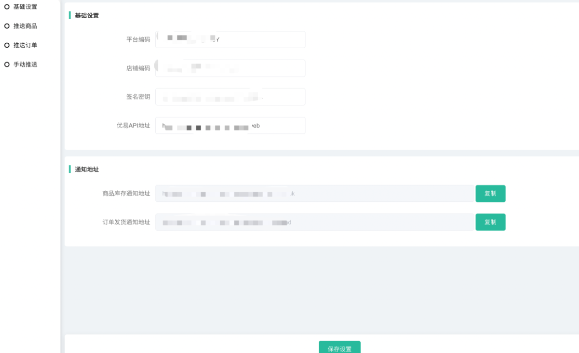 1、平台编码、店铺编码、签名密钥、优易请求地址(每个账户单独请求地址,填写对应请求地址,这方面需联系优易)、商品库存通知地址、订单发货通知地址——需登录(优易官网:http://youyierp.800best.com/)联系优易客服购买接口后获取。注意:填写基础信息时,前后不能有空格,填写完毕后需检查下。