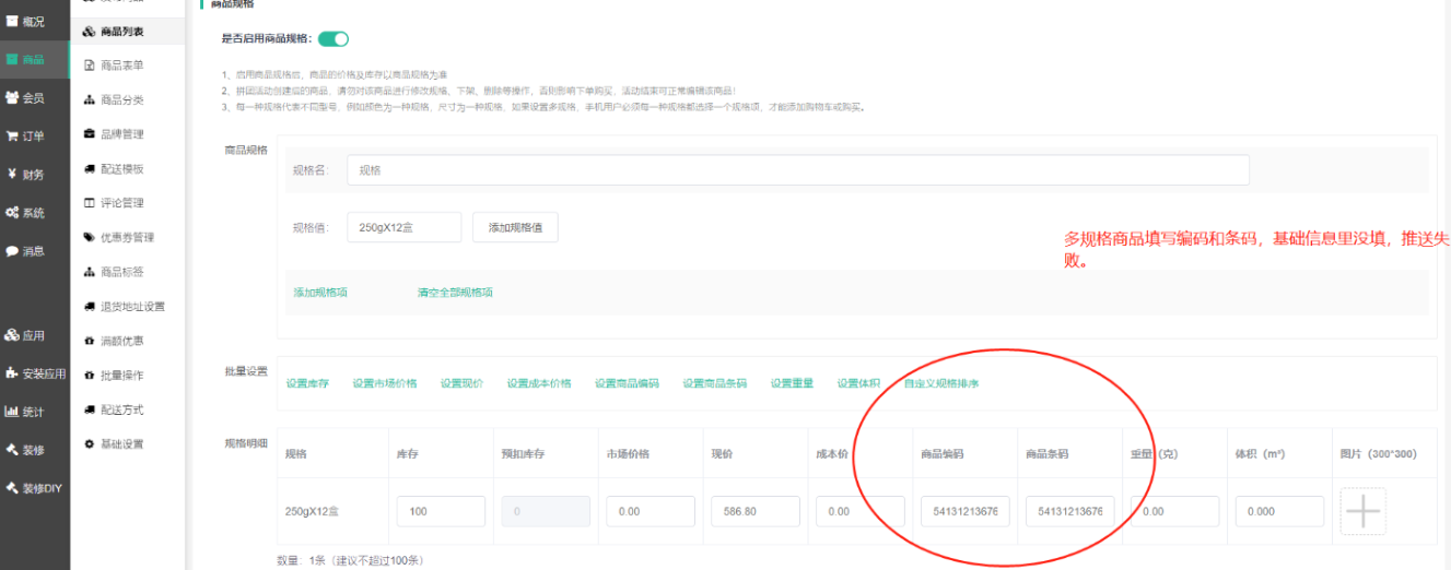 多规格商品,基本信息处的商品编码条码需要填写外,同时规格里面的商品编码、商品条码也需要填写,两者缺一不可,如果只是填写其中一项,会导致推送不全从而导致后续的异常
