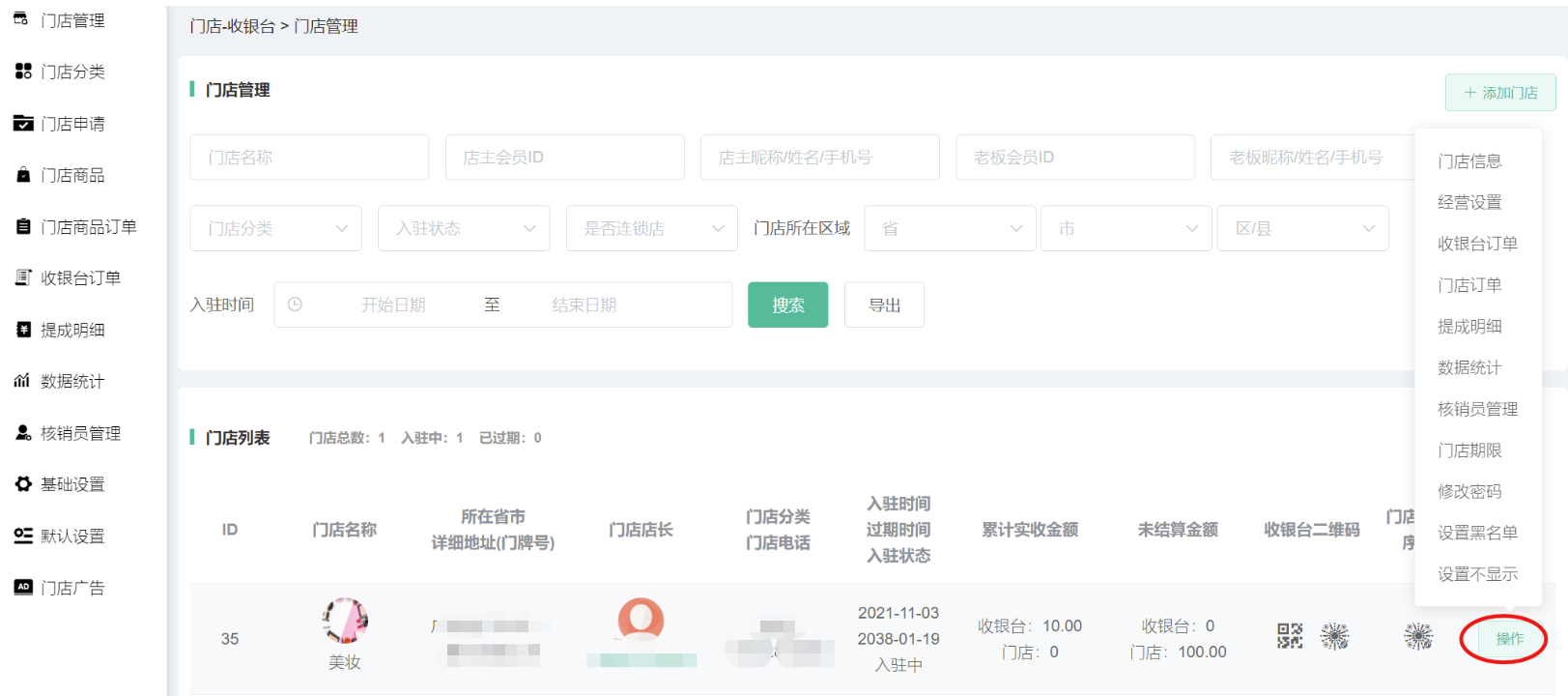 申请通过/后台添加的门店,在门店信息显示,可搜索查看门店的id、名称、所在省市详细地址、门店店长、门店分类、入驻时间、累计实收金额、未结算金额、收银台二维码、门店小程序码等