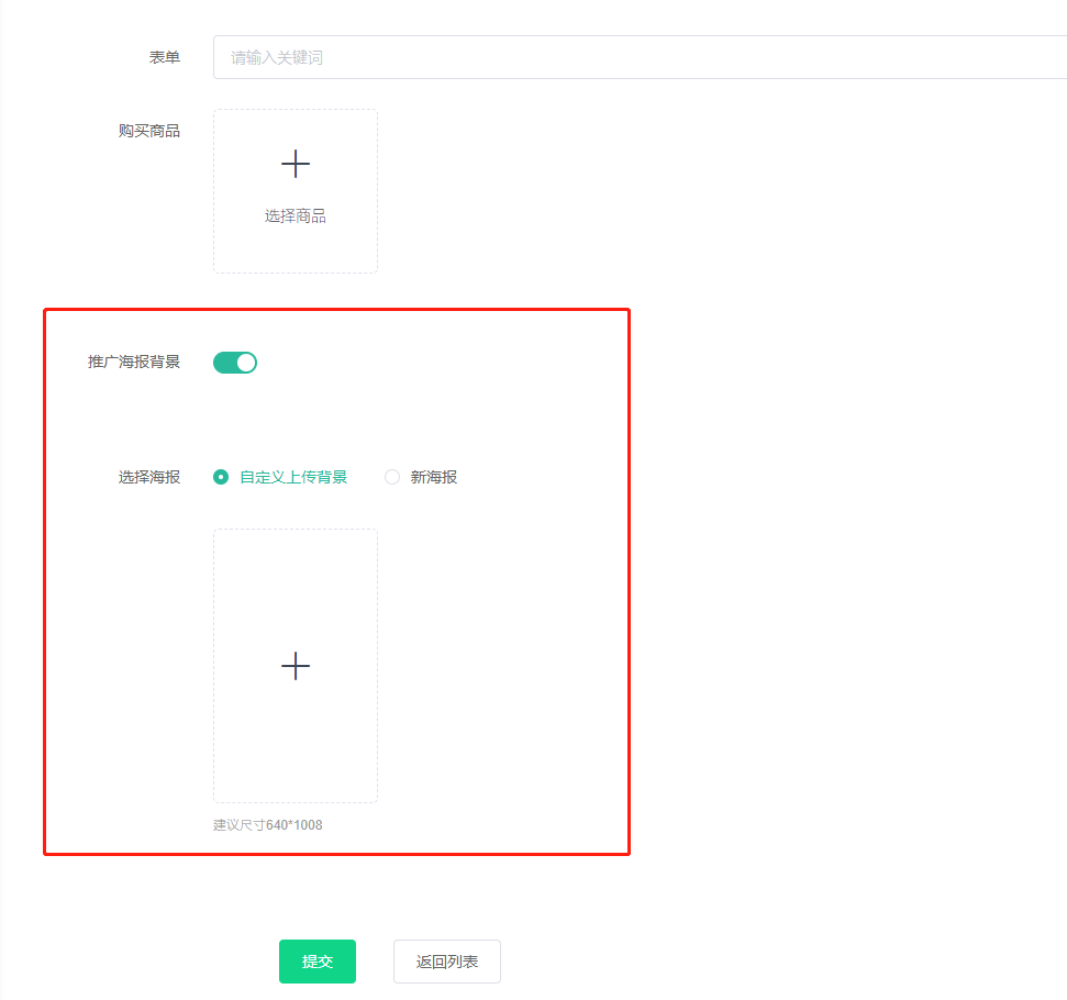 选择海报:(1)自定上传背景。开启则前端有显示,建议尺寸640x1008(二维码固定右下角显示,不支持挪动位置)