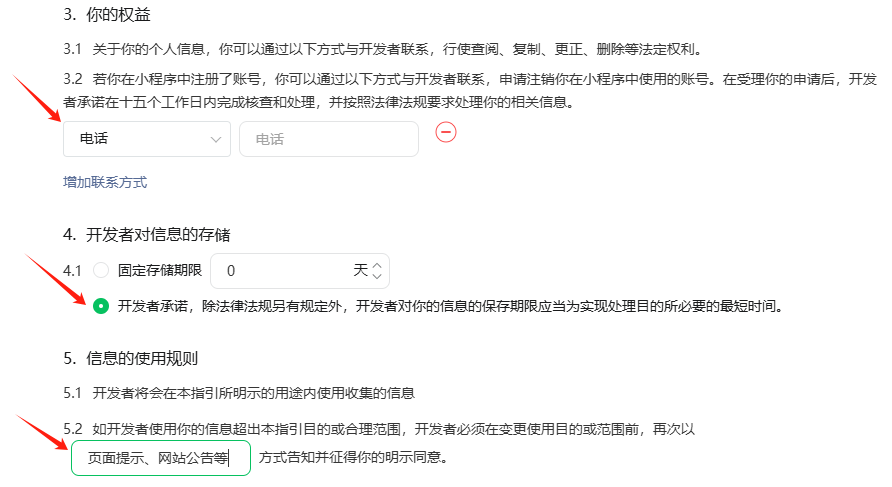 “5.2”建议填写再次以  页面提示、网站公告等 方式告知并征得你的明示同意。这方面的告知方式没指定,用户可按参考的填写的,或者自行编辑,比如是 通过电话联系、邮件回复 等方式告知。