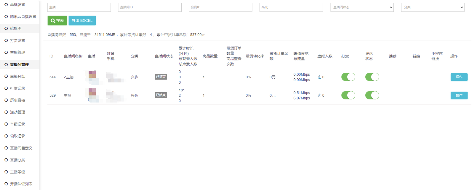 操作-直播带货订单、直播分红、打赏记录。
