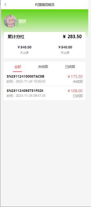 点击进入代理商招商员页面,显示招商累计分红(包含未结算、不包含已失效),月业绩、年业绩,招商分红明细(按订单显示,一笔订单多笔招商分红会累计一起显示)