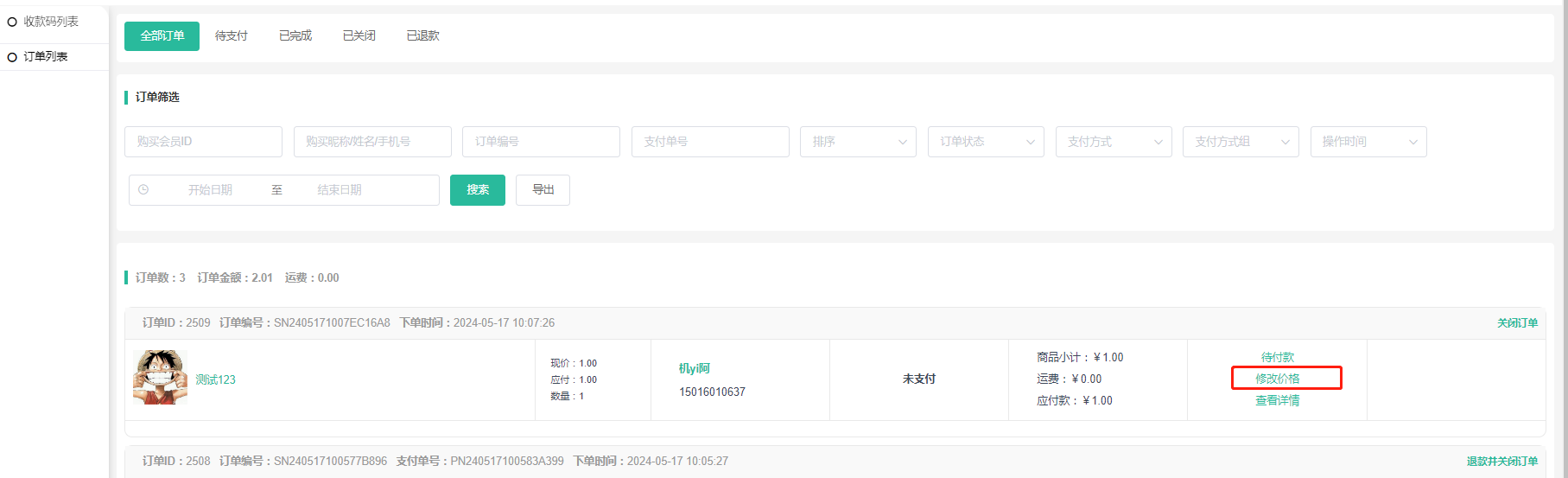 订单筛选:根据购买会员id、购买者昵称/头像/手机号、订单编号、支付编号、排序(分订单ID排序:新创建订单显示在前;会员排序:按会员ID大小排序,ID大靠前显示)、订单状态、支付方式、支付方式组、操作时间等条件搜索.