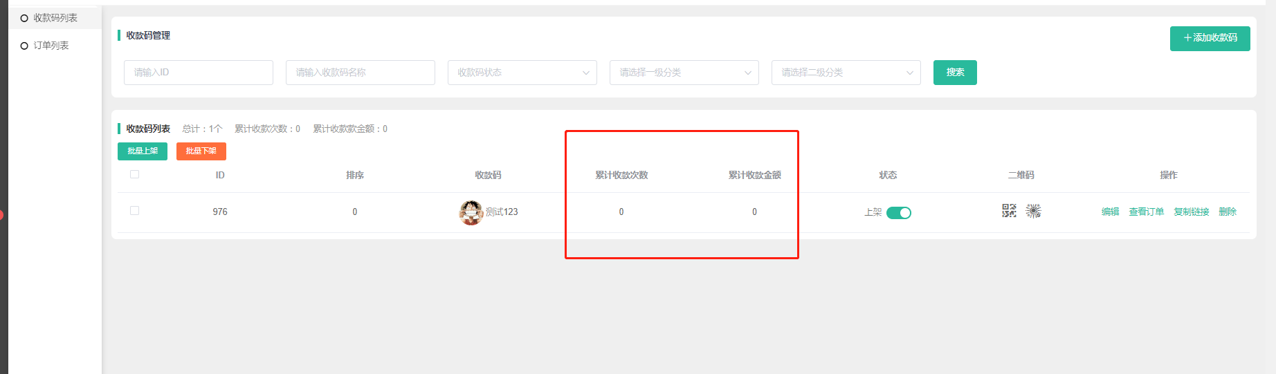 可根据收款码ID、收款码名称、收款码上下架状态、收款码分类快速查找,可查看到收款码累计收款次数、累计收款金额(已完成订单)、查看对应扫码买单订单.