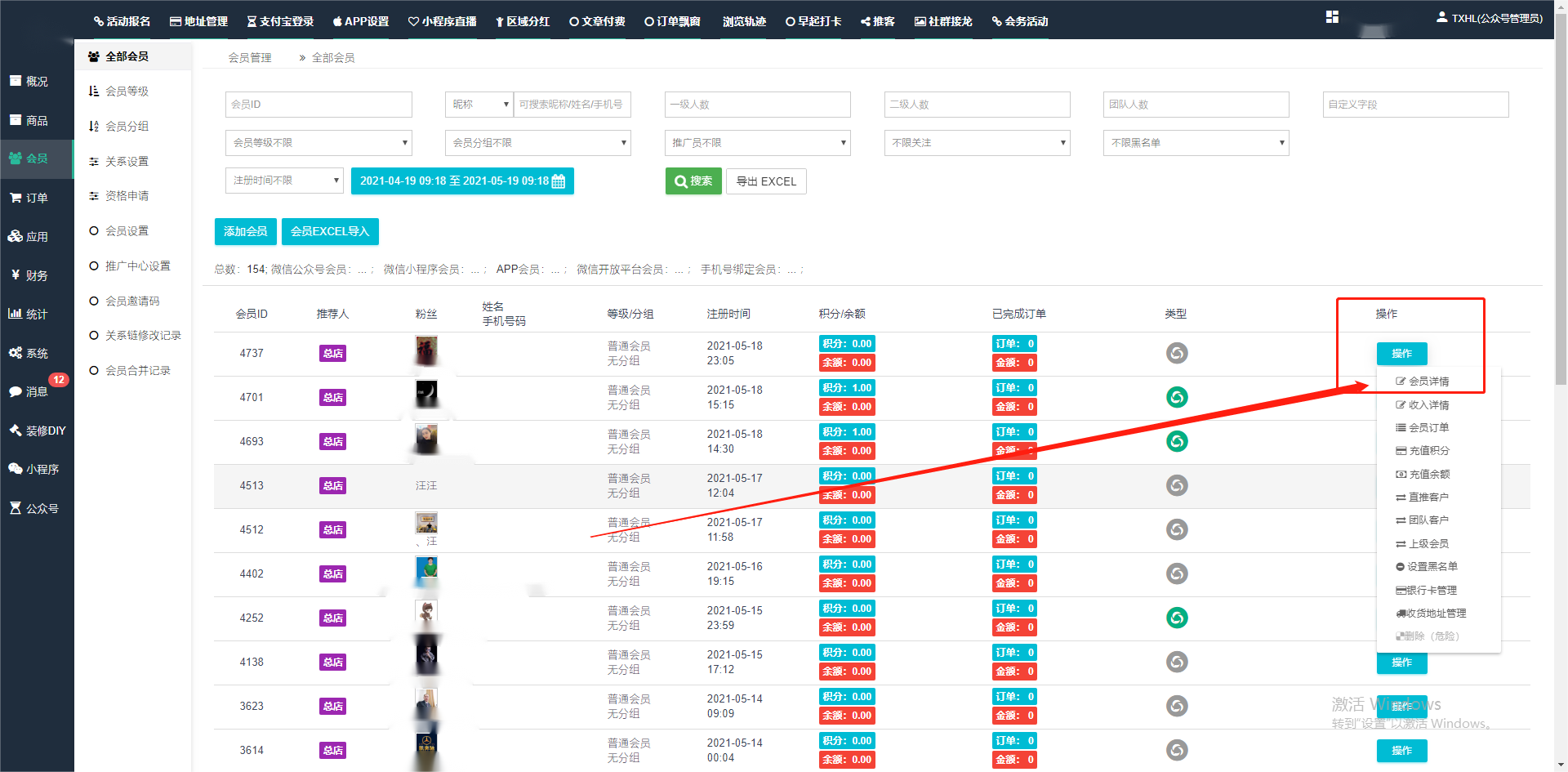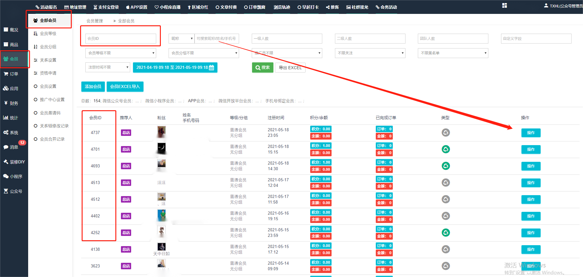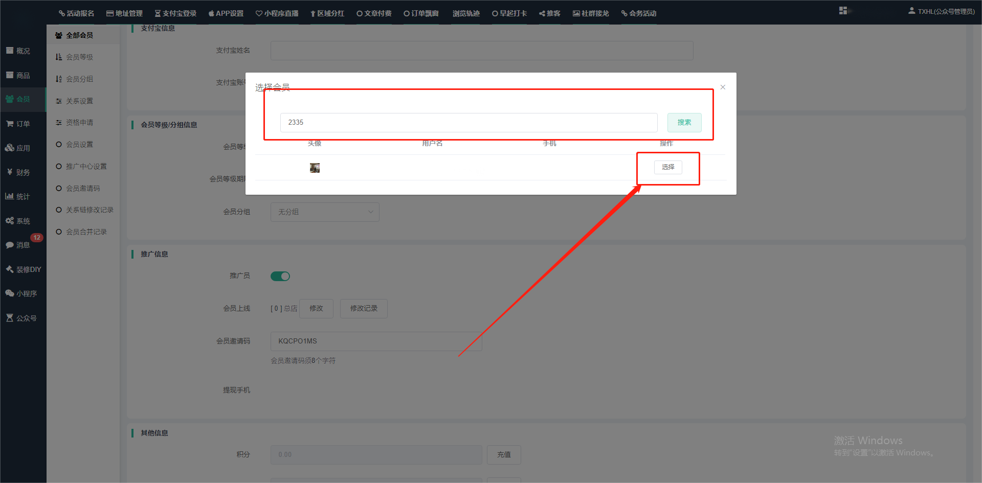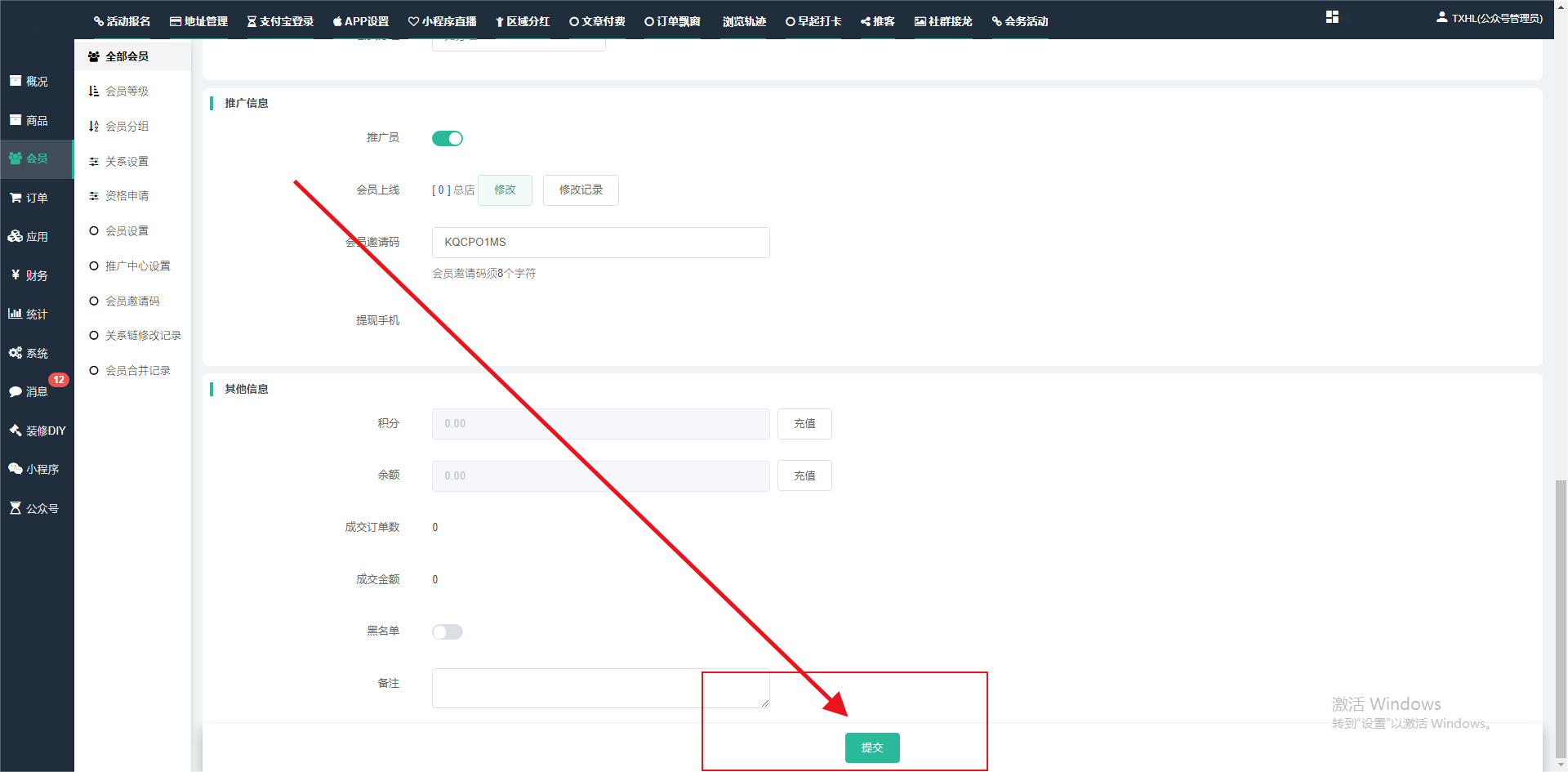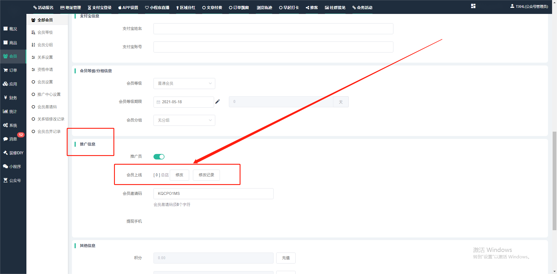 目录 搜索 展开 一、前期准备资料二、数字乡村码-上线操作指南1、服务号的申请流程及认证2、申请小程序流程3、开放平台绑定小程序和公众号三、数字乡村码-系统操作数字乡村码系统管理-概况数字乡村码-商品管理1、发布商品2、商品列表3、商品表单4、商品分类5、品牌管理6、配送模板7、评论管理8、优惠券管理9、商品标签10、退货地址设置11、满额优惠12、批量操作13、配送方式14、基础设置15、商品隐藏四、数字乡村码-会员管理1、全部会员2、会员等级3、会员分组4、资格申请5、会员设置6、推广中心设置7、会员邀请码8、会员关系链修改关系链修改记录9、会员合并记录10、账号注销管理11、会员设置中心五、数字乡村码-订单管理1、订单管理列表2、订单处理流程3、订单状态4、订单修改价格5、订单退款退货6、多包裹发货7、批量发货订单操作步骤8、催发货订单9、物流查询六、数字乡村码-财务管理1、余额设置2、会员余额3、充值记录4、转让记录5、余额明细6、收入明细7、提现设置8、提现统计9、积分管理10、转账审核11、收益广告12、批量充值七、数字乡村码-系统管理1、商城入口2、商城设置①、商城设置②、订单设置③、物流查询④、短信⑤、联系方式⑥、分类⑦、优惠券⑧、分享⑨、幻灯片⑩、广告位⑫、地图设置3、交易设置4、微信模板消息自定义消息模板(新版)自定义消息模板(旧版)小程序消息模板公众号模板消息变更公告5、语言设置6、权限管理7、多媒体管理八、数字乡村码-消息管理九、数字乡村码-应用管理十、数字乡村码系统-数据统计十一、数字乡村码-页面装修DIY1、模板管理2、店铺页面3、顶部导航4、底部导航5、DIY模板市场6、首屏广告7、基础设置8、装修DIY尺寸建议十二、供应商功能插件操作指南1、供应商2、门店-收银台门店申请和使用步骤门店管理①、门店-收银台 营销设置②、门店-收银台 分润设置门店分类门店申请门店审核门店商品门店商品订单收银台订单数据统计核销员基础设置默认设置门店装修3、微社区4、会务活动十三、营销插件操作指南活动报名提货卡新人奖微店问卷调查积分视频分享1、视频分享基础设置2、视频分享发现管理3、视频分享分类管理4、视频分享评论管理5、视频分享分红记录6、视频分享短视频中心每日红包幸运大抽奖签到优惠券二维码任务奖励优惠劵文章音频文章付费文章限时购新海报拓客卡操作流程积分活动素材中心视频红包十四、入驻门店应用类1、门店预约2、附近商品3、门店定位设置4、门店控制5、门店满额包邮6、门店满额减7、导入商品8、门店搜索9、门店股东10、核销券11、多门店核销1、商城后台设置2、前端功能演示十五、常见问题1、后台登录密码修改流程2、会员-余额,积分,后台如何进行充值与扣除3、如何修改上下级关系4、一种万能的获取商城小程序路径的方法 暂无相关搜索结果! 阅读次数:1438 本文档使用 模王系统 发布 3、如何修改上下级关系 如何修改上下级关系一.如何修改上下级关系?1.会员-全部会员-可以通过搜索用户的独立ID,或者用户微信昵称,找到此会员,然后点击右边的(操作)2.再点击会员详情。3.滑到下面,有个推广信息-会员上线,点击修改4.输入上级的ID号,点击搜索,出来此上级会员后点击选择。5.滑到最下面,一定要点击提交按钮。文档更新时间: 2024-01-05 14:50 作者:链上旅行