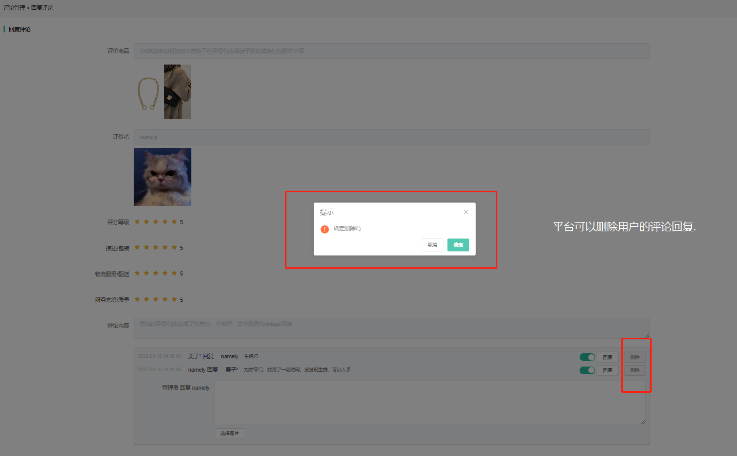 (1)平台可以删除商品主评论