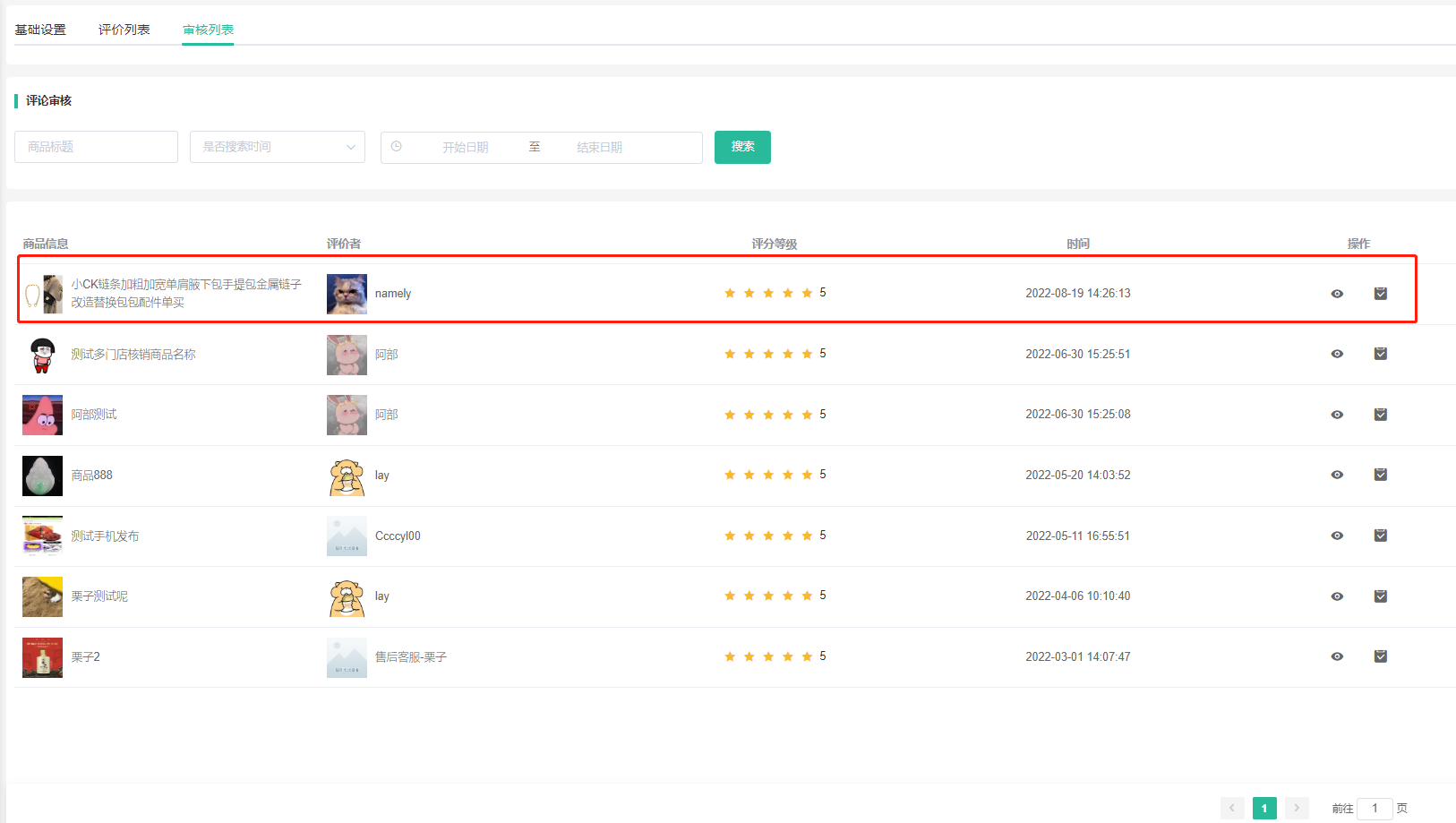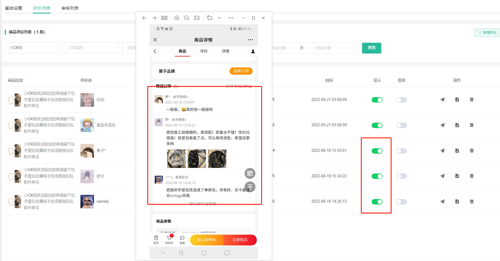 支持查看会员商品评价、是否通过审核、是否显示、是否置顶。